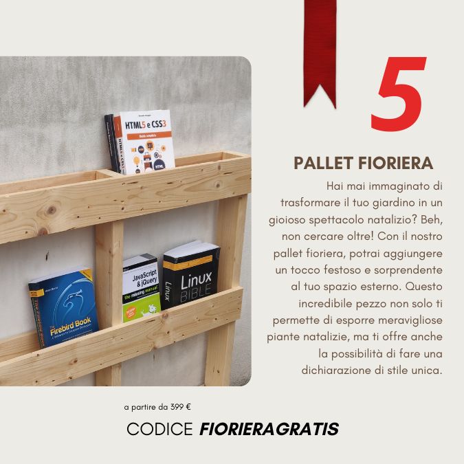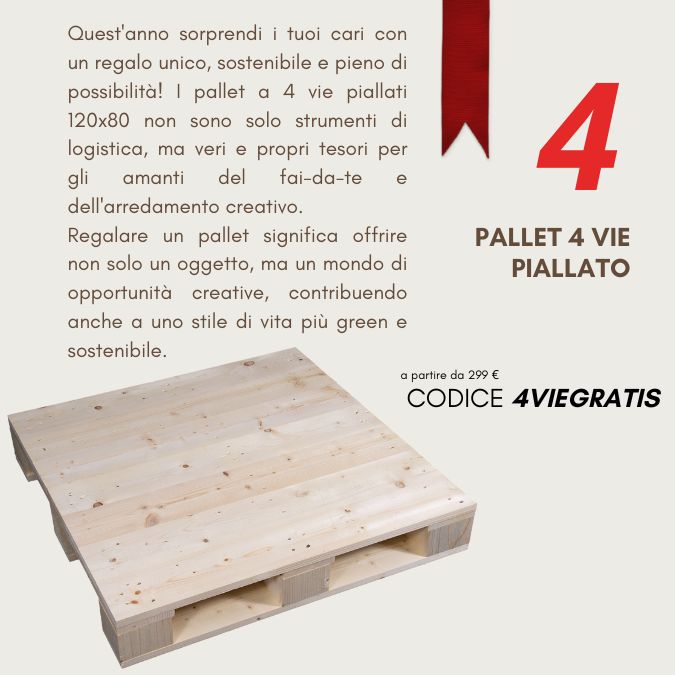 Siamo così generosi durante questo Natale che stiamo regalando un pallet 4 vie piallato 120x80 con un ordine da soli 299 euro! Che aspetti? Approfitta subito di questa super offerta e aggiungi un tocco extra di festa al tuo regalo di Natale!