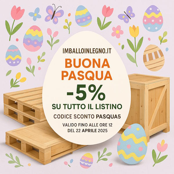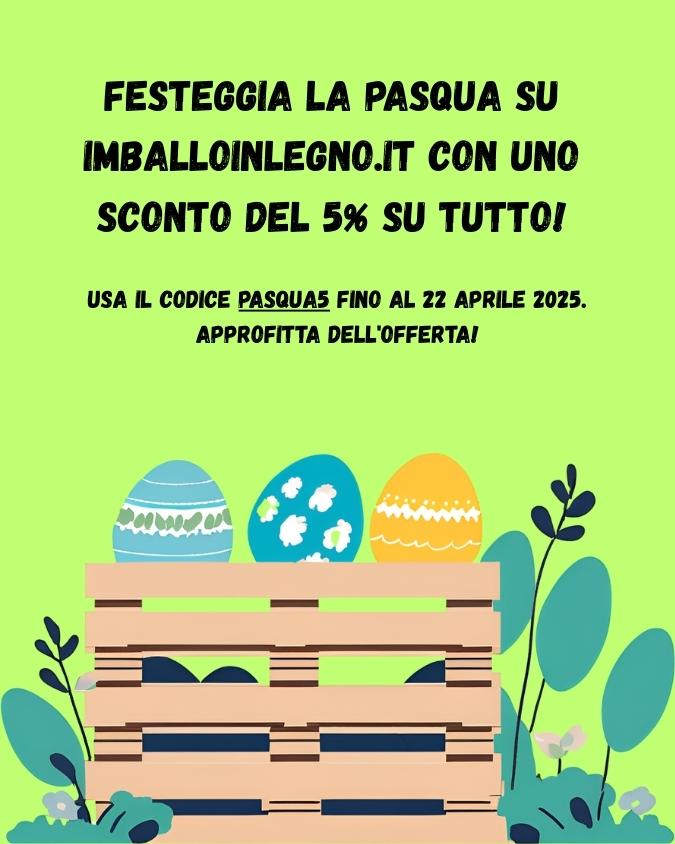 Affrettati! Solo per un tempo limitato puoi approfittare del fantastico sconto del 5% su tutto il listino di imballoinlegno.it! Usa il codice sconto PASQUA5 prima del 22 aprile 2025 alle ore 12 e risparmia su tutti i tuoi acquisti. Non perdere questa incredibile occasione, fai scorta di imballaggi in legno ora!