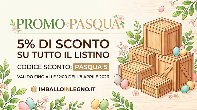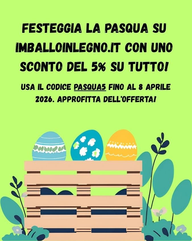 Affrettati! Solo per un tempo limitato puoi approfittare del fantastico sconto del 5% su tutto il listino di imballoinlegno.it! Usa il codice sconto PASQUA5 prima del 8 Aprile 2026 alle ore 12 e risparmia su tutti i tuoi acquisti. Non perdere questa incredibile occasione, fai scorta di imballaggi in legno ora!
